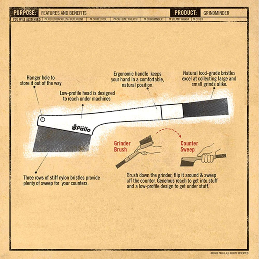 The Pallo GrindMinder is one part Grinder Brush and one part Counter Brush all in one convenient tool. Sweep down the grinder, flip it around and sweep off the counter. Generous reach to get into stuff and a low profile counter head to get under stuff.